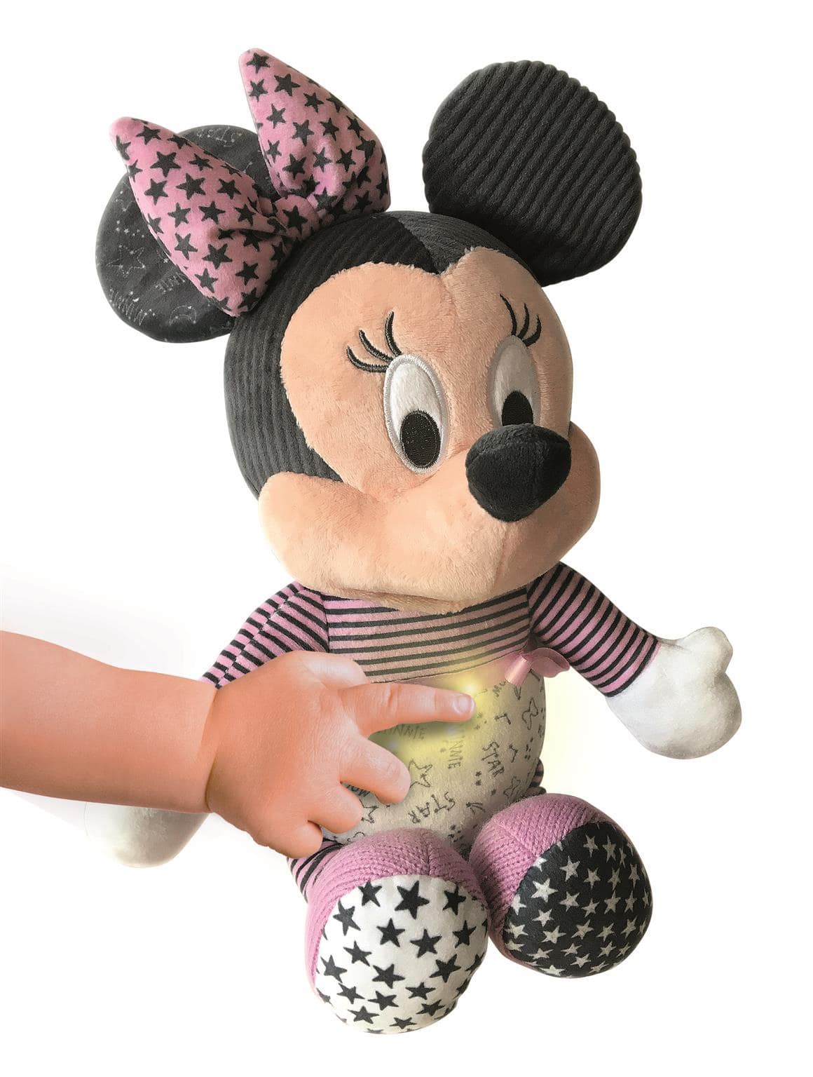 En blød og sofistikeret interaktiv Baby Minnie-plysbamse til at ledsage børn sødt, når det er tid til at sove. Baby Minnie gengiver søde melodier, der er specielt komponeret for at hjælpe børn med at slappe af ved at berolige og forsikre dem. Lyset på Baby Minnies mave har en kromoterapi-funktion, der skaber en behagelig følelse af sikkerhed i den før-søvnfase og hele natten. De mange forskellige plysmaterialer stimulerer udviklingen af taktile og sensoriske færdigheder.