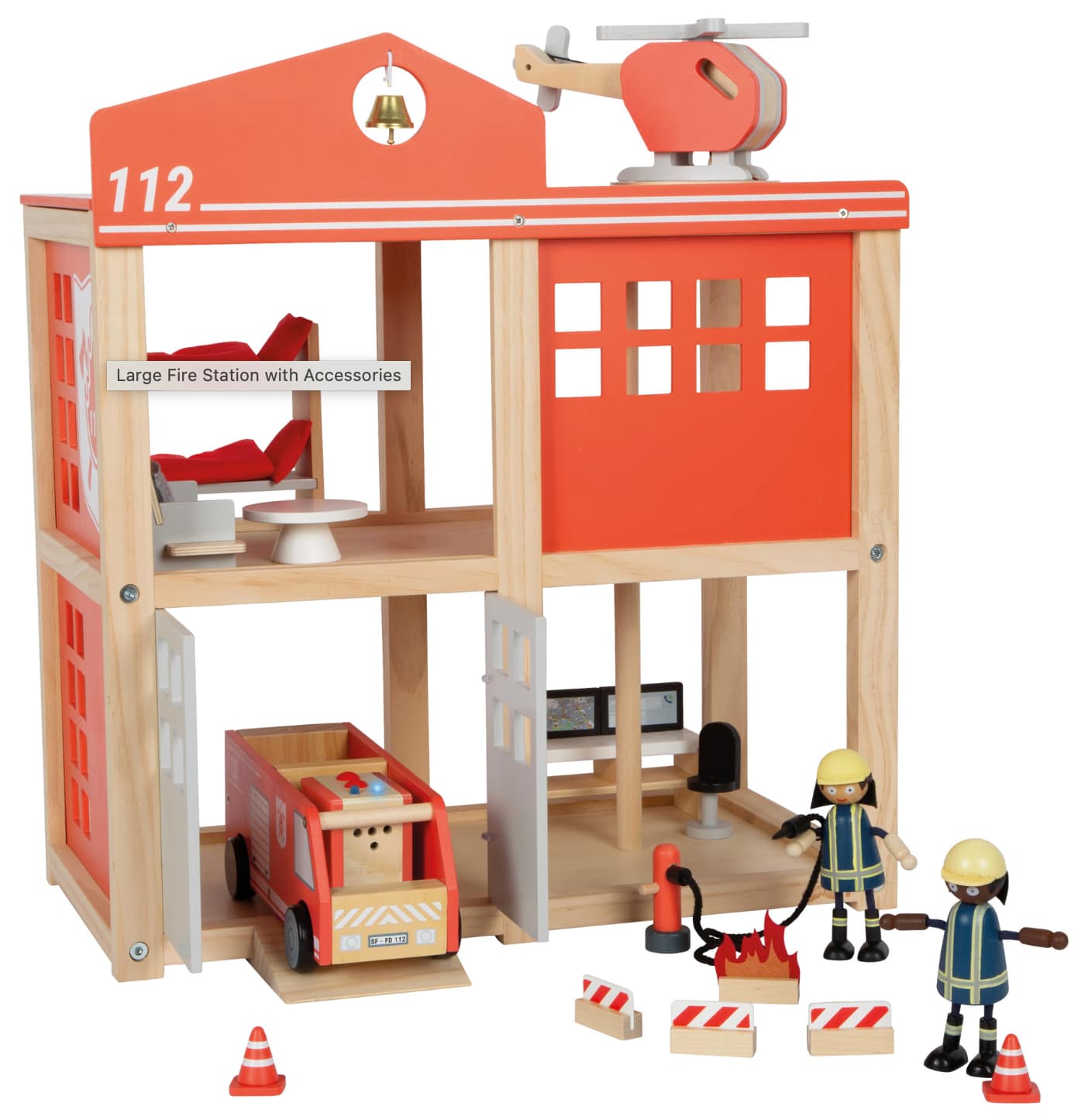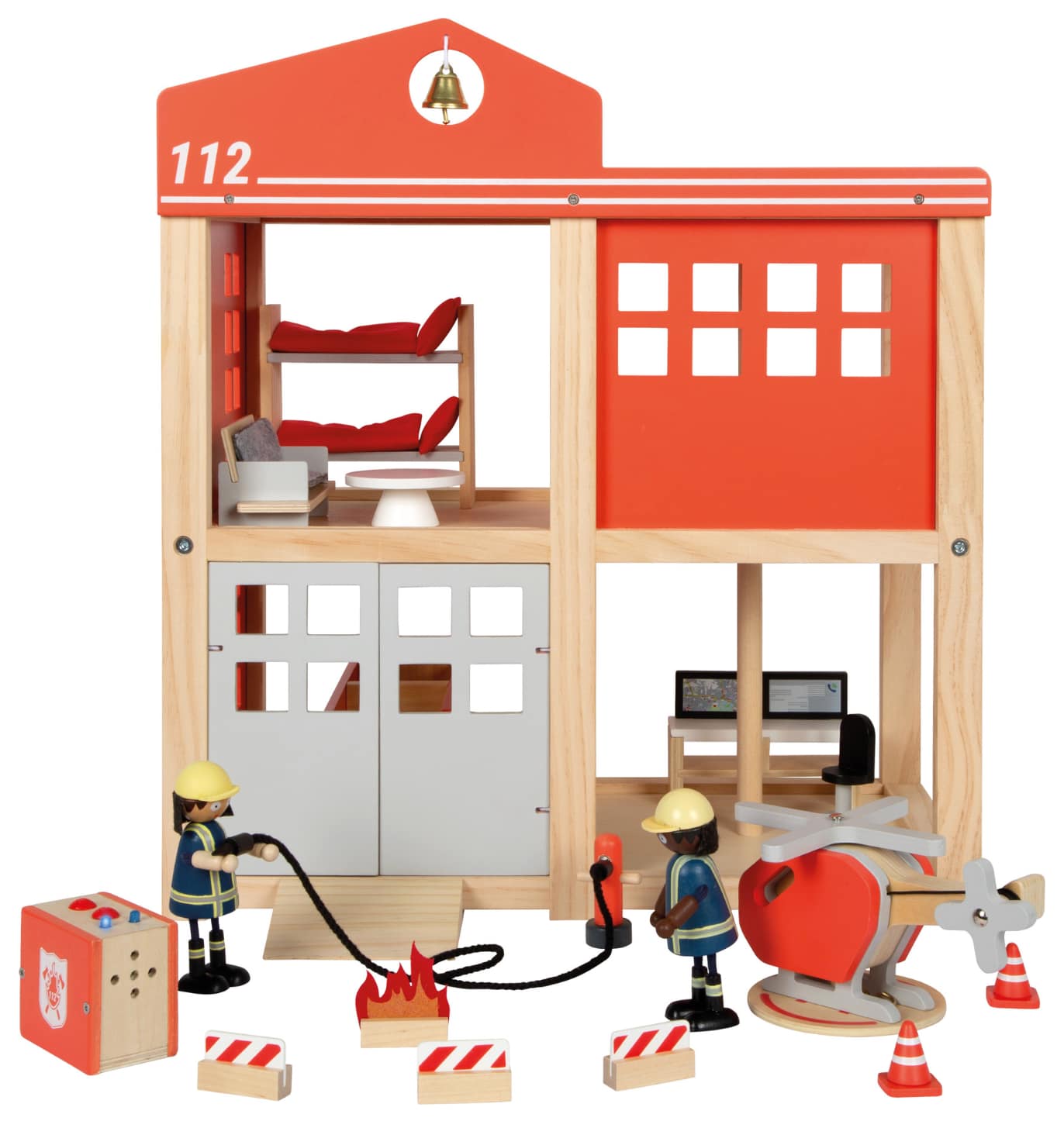 Den store brandstation består af flere etager og funktioner, som giver børn mulighed for at fordybe sig i dramatiske og realistiske legeoplevelser. Her kan brandmændene sove i køjerne, træne, holde øje fra udkigsposten og hurtigt suse ned ad brandstangen, når alarmen lyder. Den medfølgende brandbil kan køres ind og ud af garagen, og med tilbehør som brandslanger, kegler og værktøj kan børn skabe en komplet redningsmission fra start til slut.