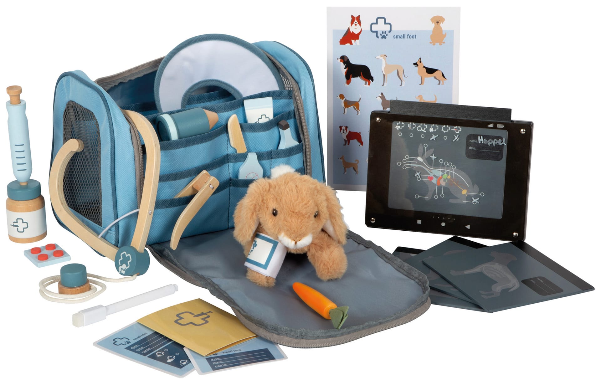 Dyrlægetaske med kanin. Dyrlægetaske med kanin er et luksuriøst og komplet legetøjssæt, der inviterer børn til at lege dyrlæge med deres egen bløde, premium kanin. Sættet indeholder et væld af tilbehør såsom stetoskop, termometer, medicinflasker og plejeudstyr, så legen bliver ekstra realistisk. Fremstillet af materialer i høj kvalitet – fra bløde, slidstærke tekstiler til holdbart træ – sikrer sættet langvarig glæde. Det styrker fantasi, rolleleg, motorik og omsorgsevner og giver timevis af kreativ leg både hjemme og på farten.