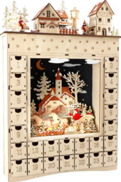 Julekalender i træ ‘Winter Dream’. Denne adventskalender er en attraktiv funktion op til jule-perioden. Lampen og husene er udstyret med LED-lys, der drives af to batterier. Dette fremhæver de attraktive filigran-udskæringer. Adventsgaverne er gemt i små skuffer. Batterier er ikke inkluderet.