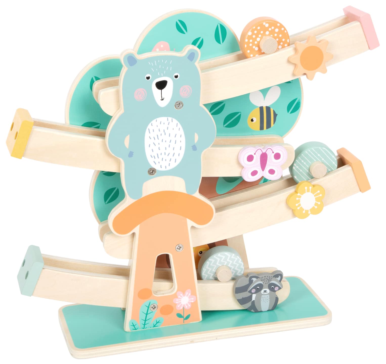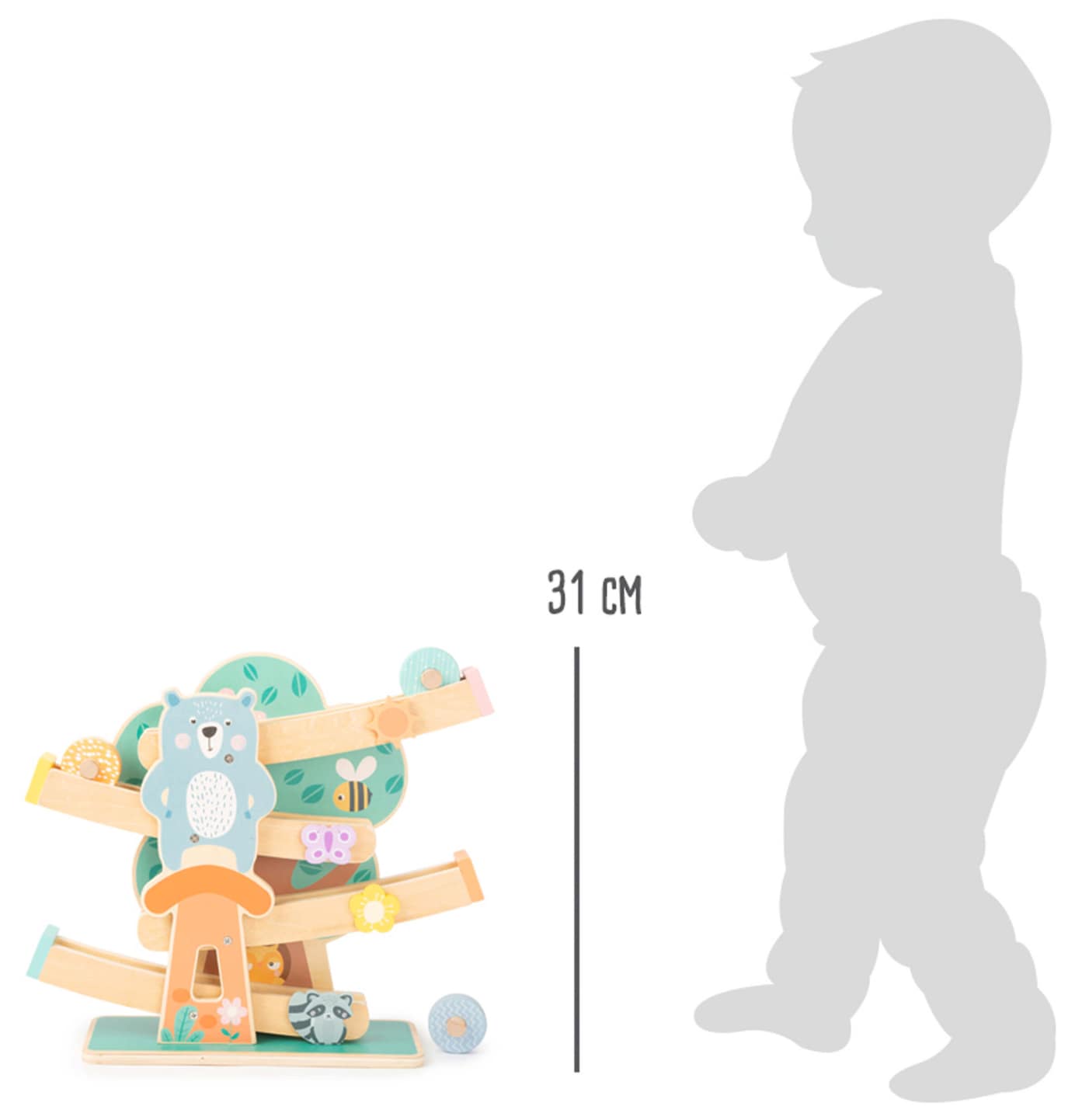 Small Foot – Kuglebane i træ – Pastel giver timevis af kreativ leg og styrker finmotorik på en rolig og hyggelig måde. De bløde pastelfarver og de tre farvede træhjul med moderne mønstre og små skovdyr gør banen spændende at kigge på og sjov at lege med. Når børnene sætter hjulene øverst og ser dem rulle hele vejen ned, træner de både hånd-øje-koordination, tålmodighed og forståelse for årsag og virkning.
