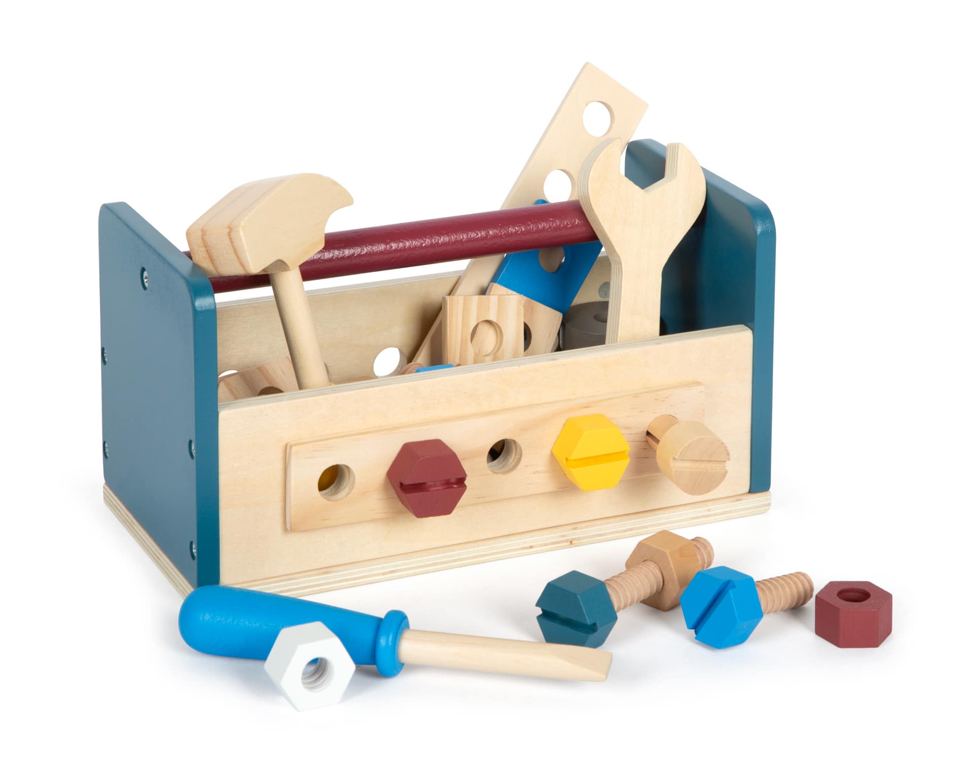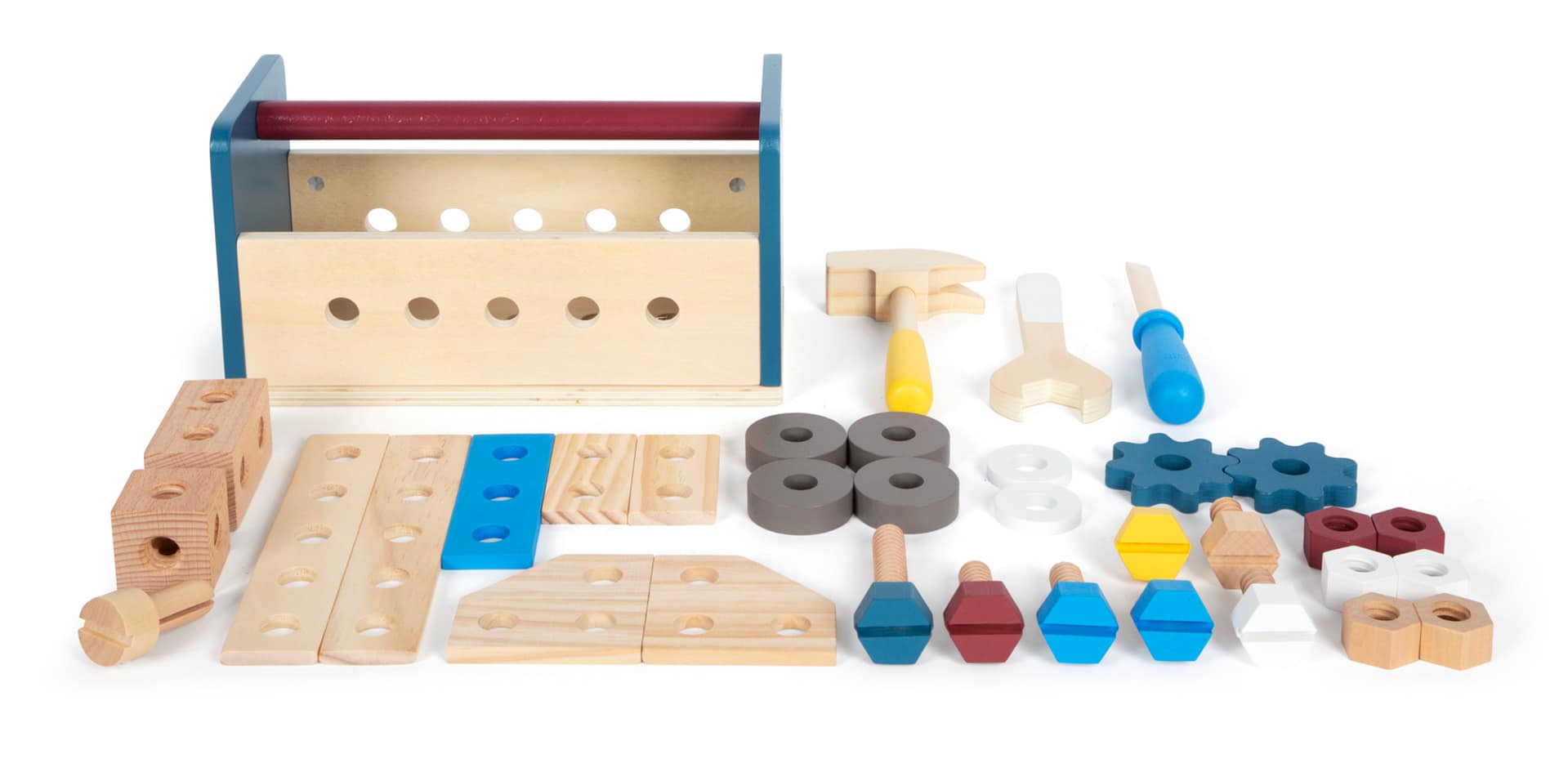 Når barnet nørkler, skruer og samler, styrkes både finmotorik, hånd-øje-koordination og problemløsningsevner. Samtidig opmuntrer legen til kreativ tænkning og aktiv rolleleg, hvor barnet kan lege håndværker, mekaniker eller opfinder. Den solide trækonstruktion giver en autentisk følelse og gør legen ekstra tilfredsstillende.