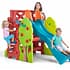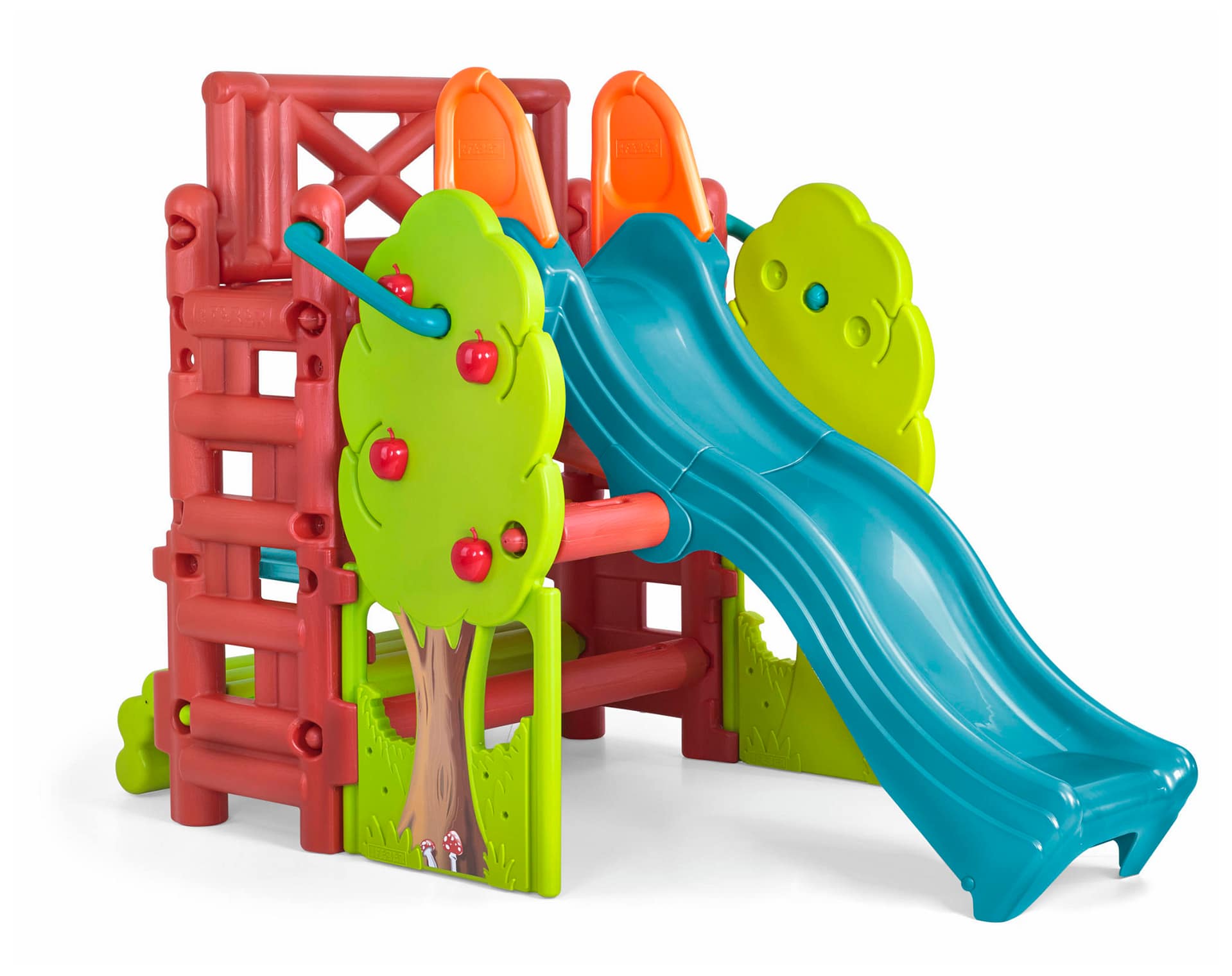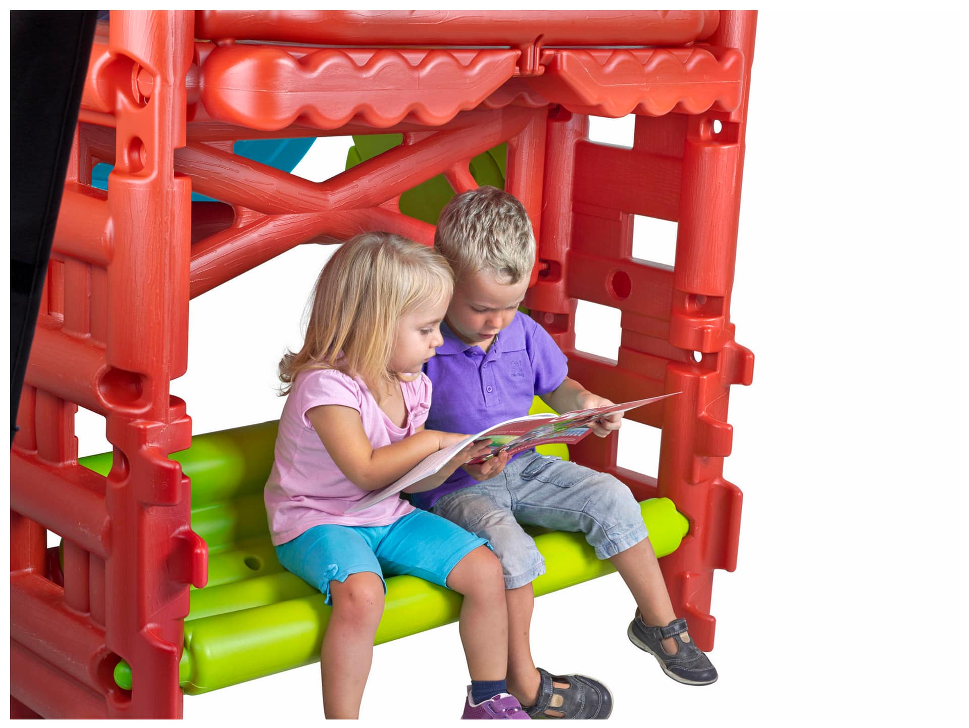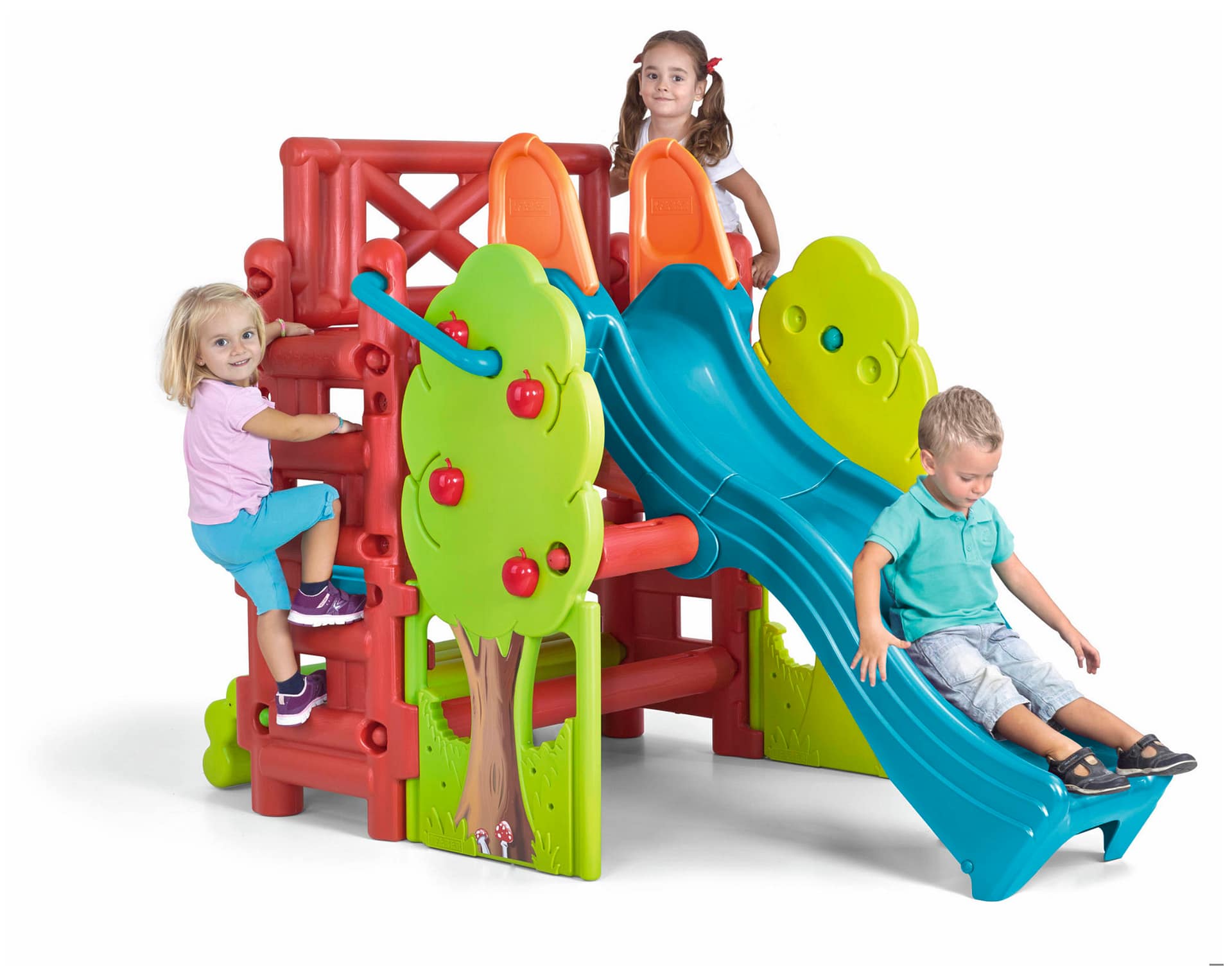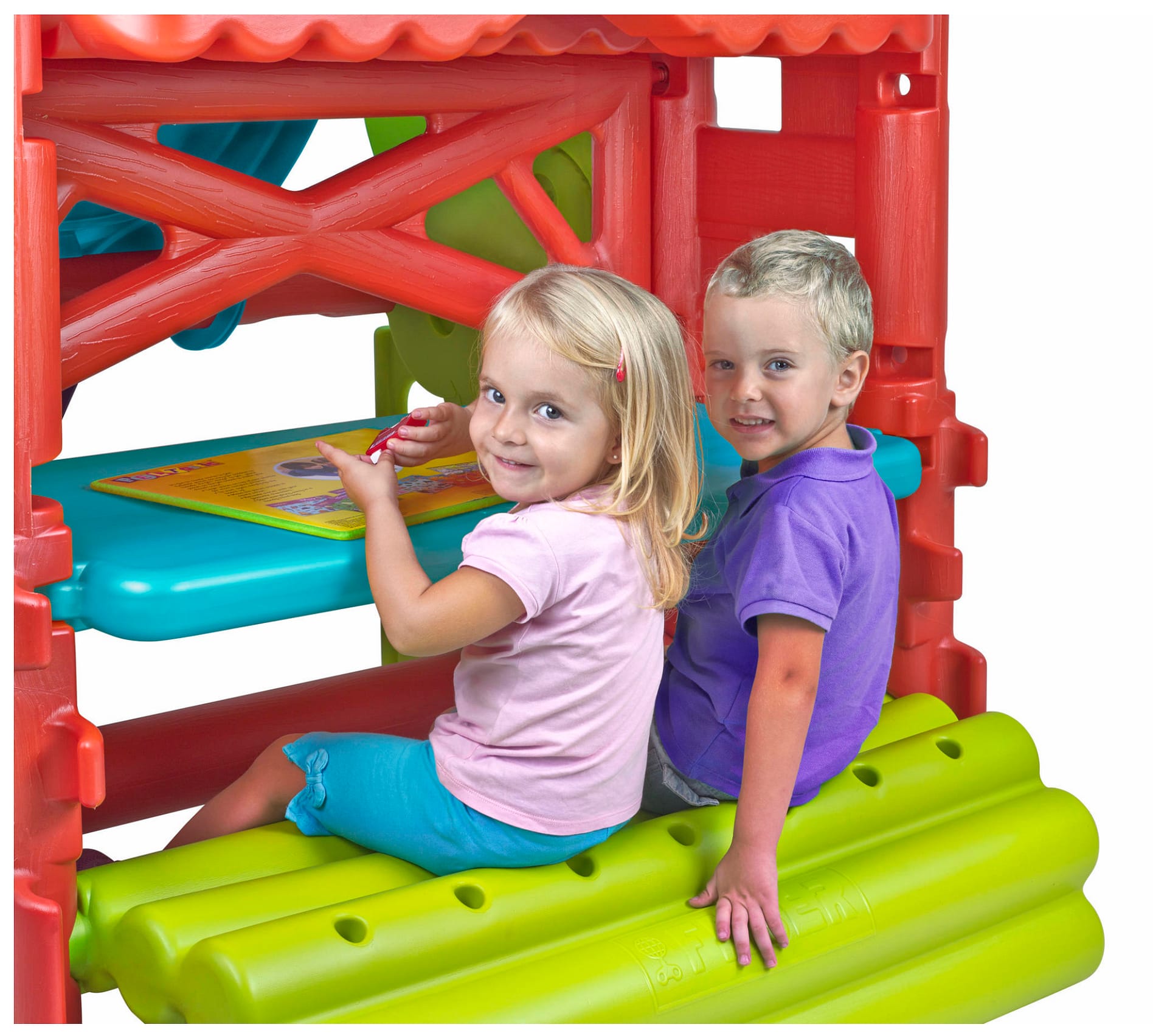 - Indeholder to side-stiger at klatre op ad, en sjov rutsjebane at glide ned ad, en bænk, der kan placeres i to positioner, og et bord, der kan omdannes til en sandkasse.